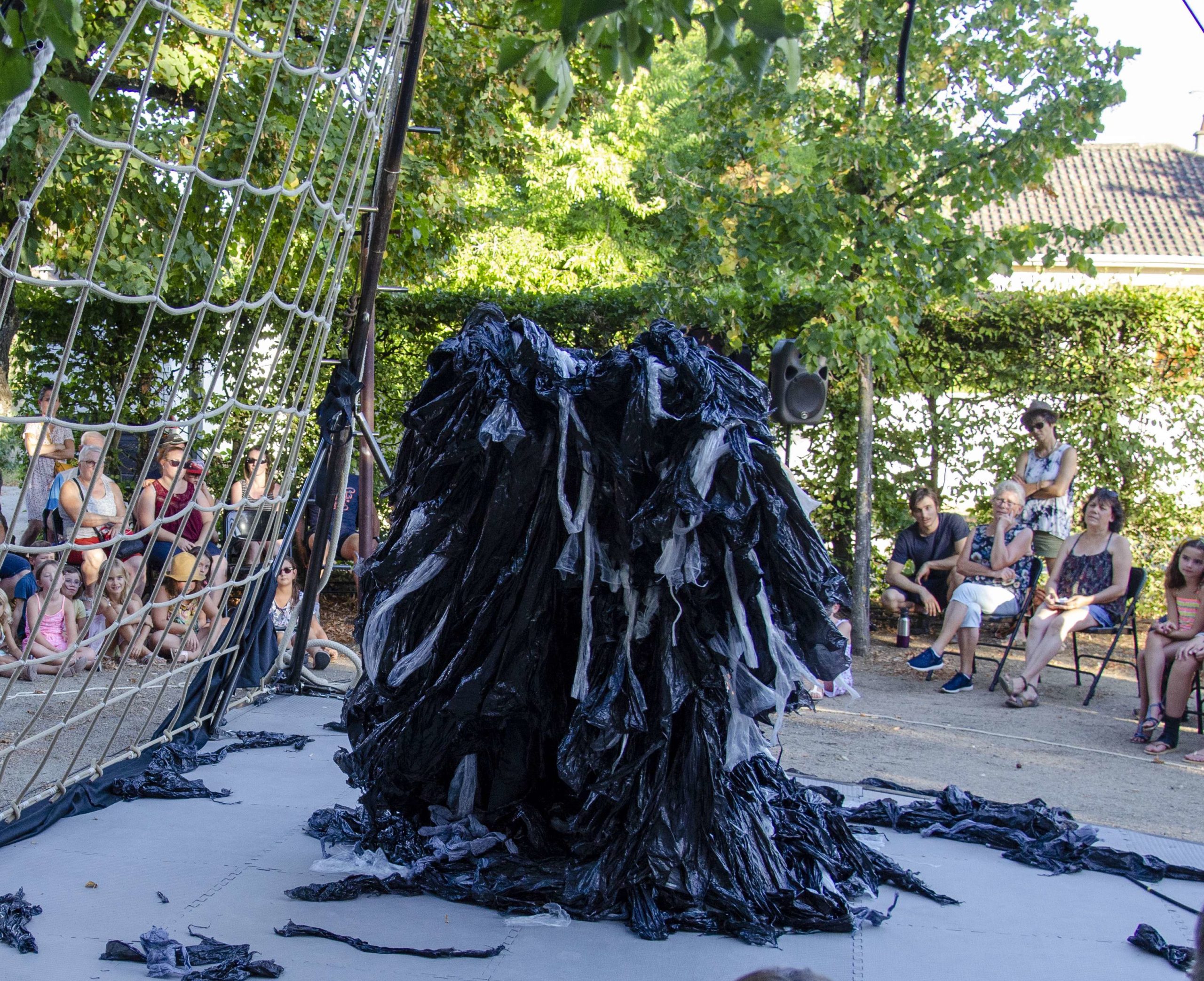 Un monticule de plastique inerte est présent au milieu de la scène. Deux êtres, dotés de sensibilités différentes, lui font face. Attraction, répulsion, céder au vice, se laisser tomber, vouloir aider, ne pas tomber avec… Nourries par l’inconscient collectif, la tête en bas, les pieds en l’air, des images naissent, se dessinent. Délires, fantasmes, tentation, résistance, rechute, résilience…