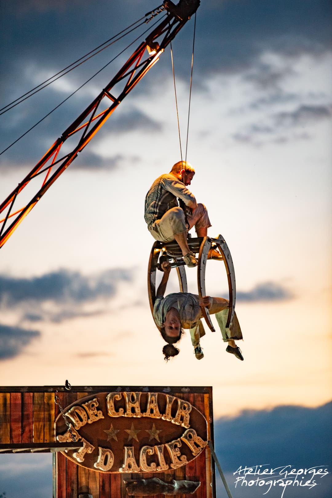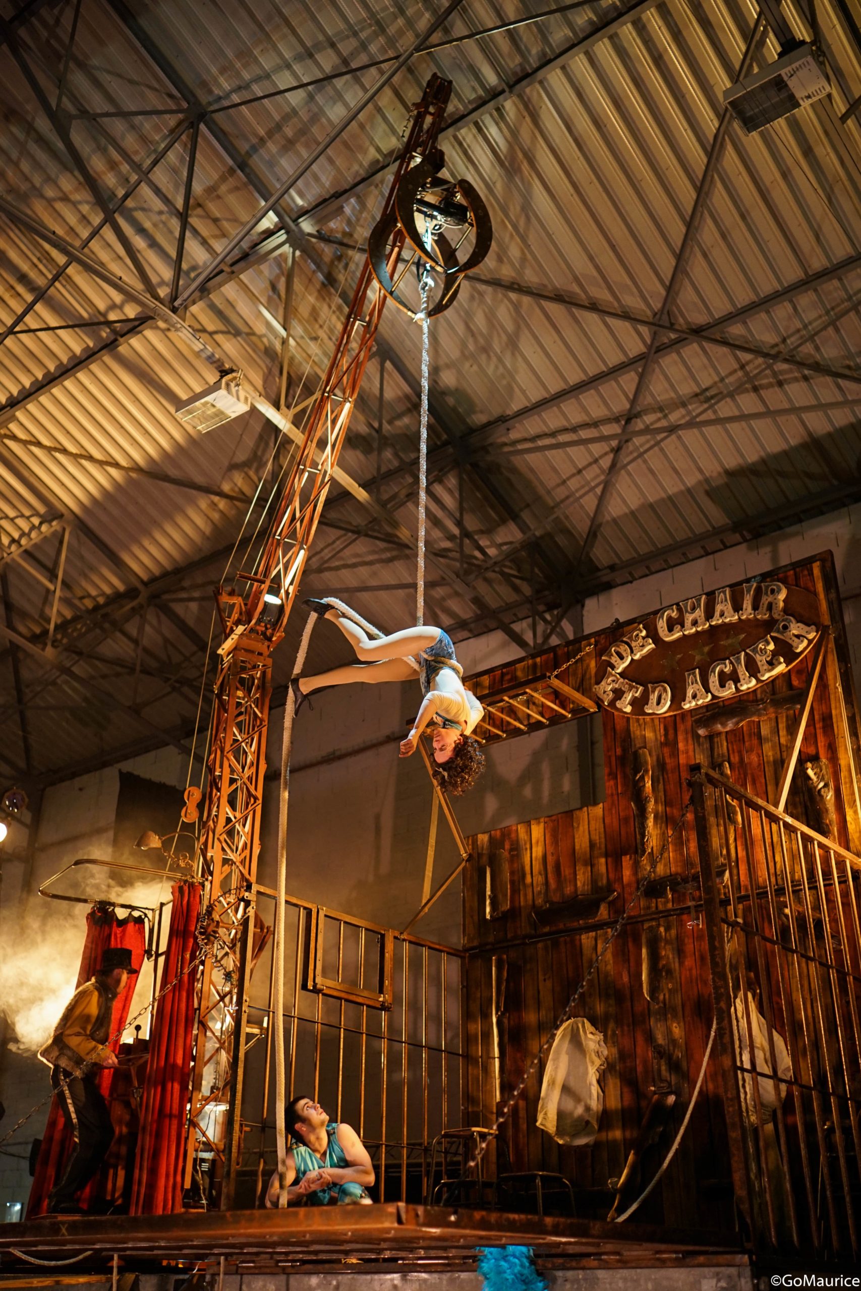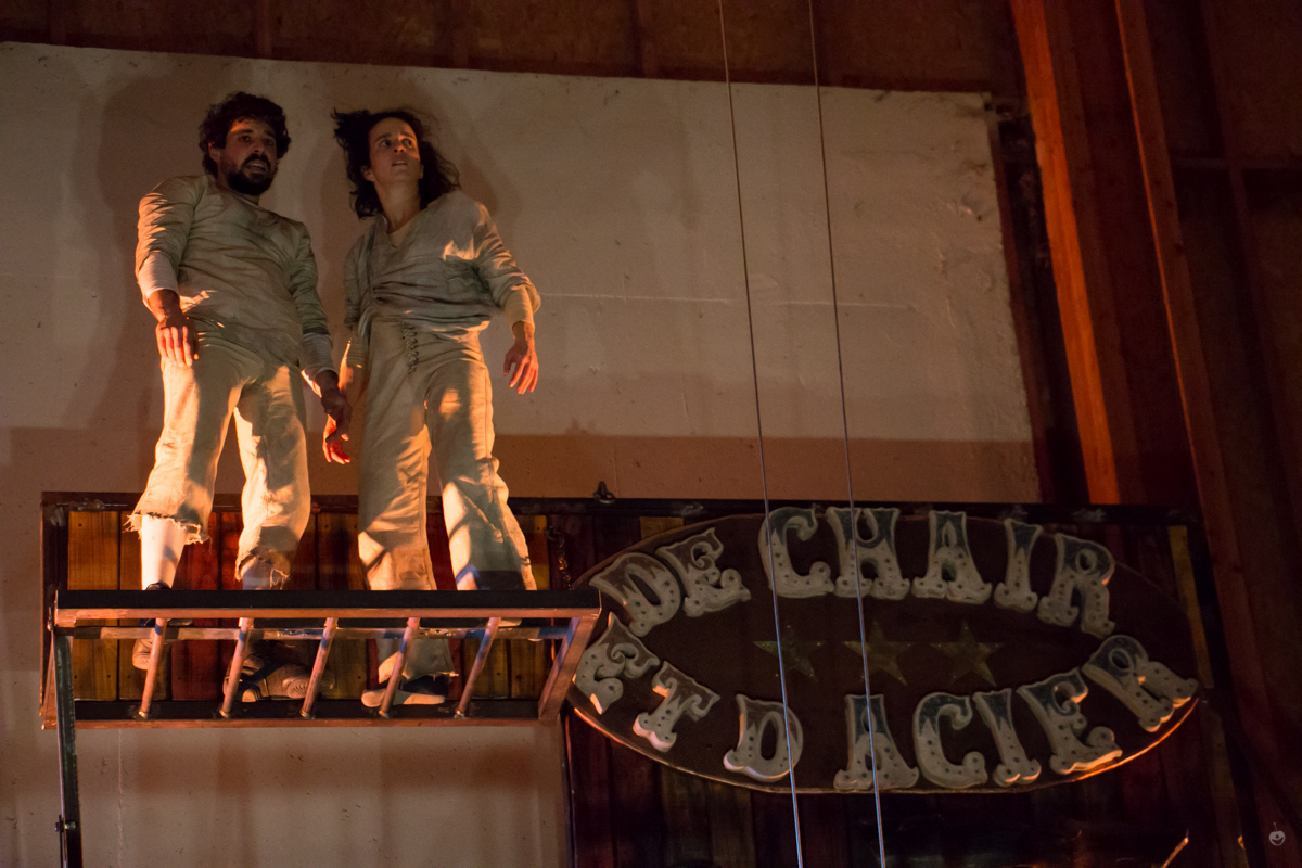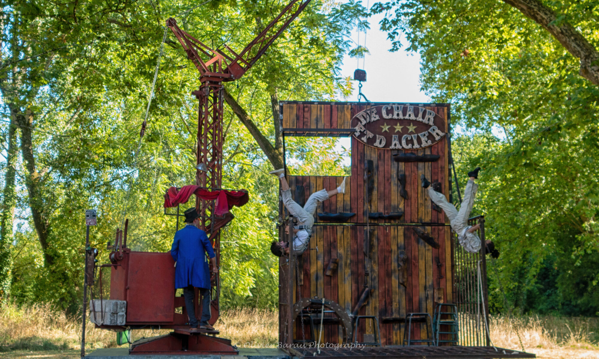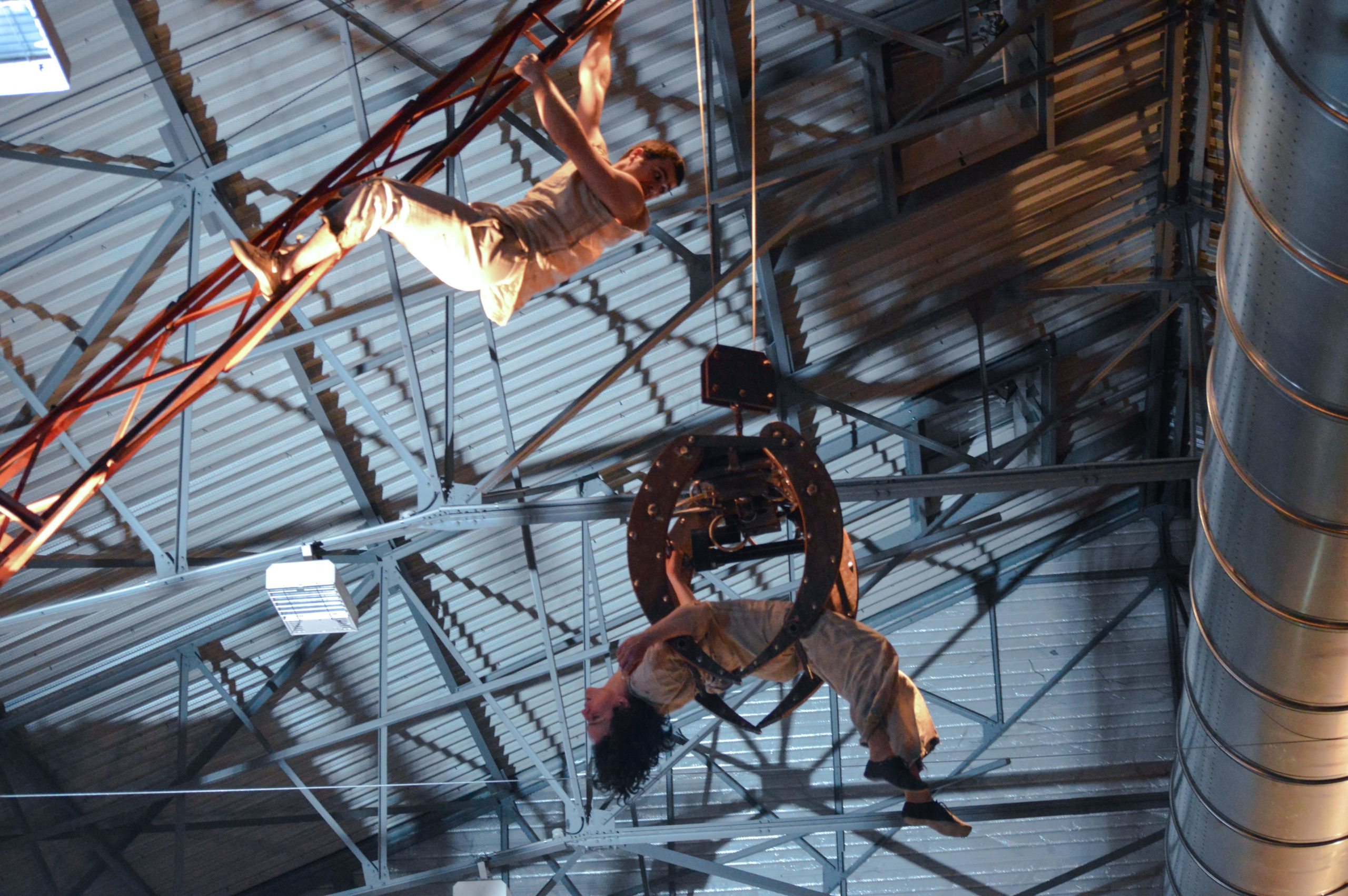 D’abord l’endroit, deux artistes de cirque mis en cage pour divertir le public, une grue et son machiniste, sombres gardiens surveillant l’attraction foraine. Puis l’envers, la fuite, l’évasion, la quête de liberté des deux prisonniers qui, dès la fin du spectacle, tentent, par tous les moyens, d’échapper au contrôle de leurs geôliers de chair et d’acier.
